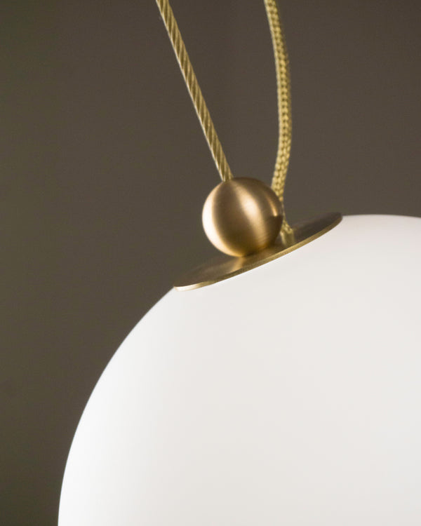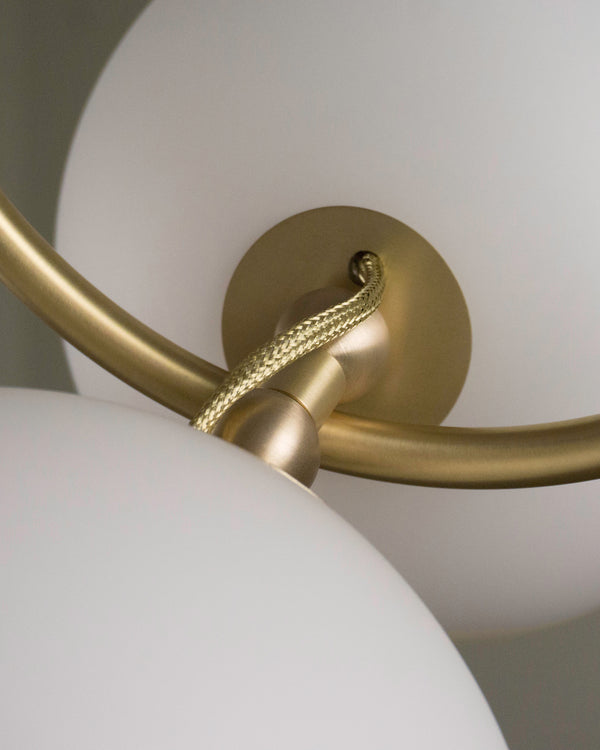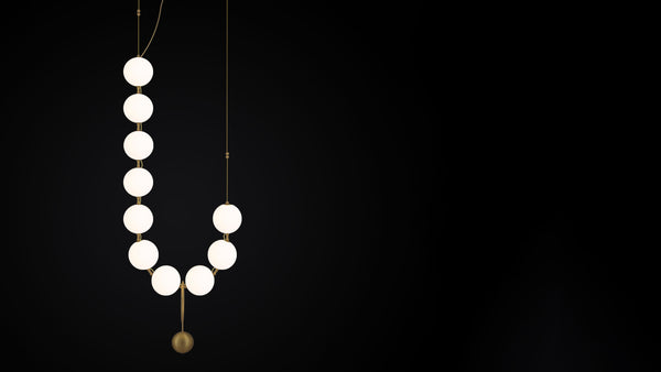 Luminous spheres highlight the connection, while the brass focal point helps define Coco's elegant form. Available in several configurations, each Coco is arranged with ten handcrafted glass spheres finished in alabaster white.