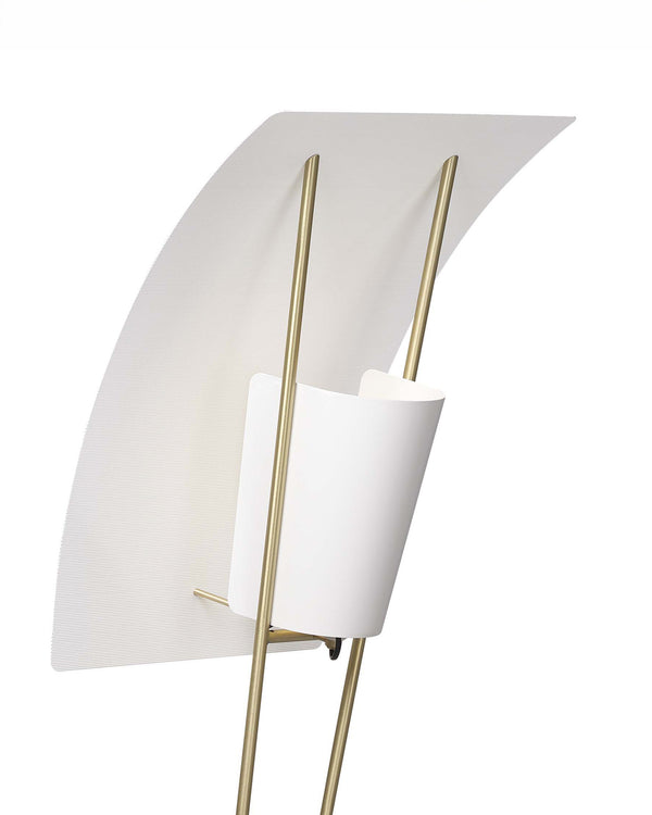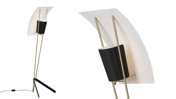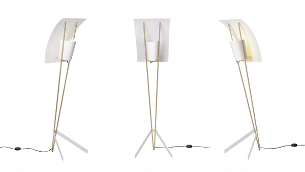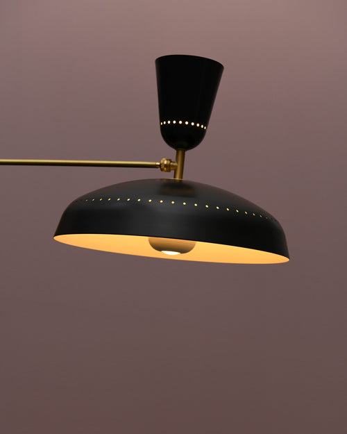 Like all of Pierre Guariche's luminaires, the light source is concealed behind a diffuser, which provides warm ambient illumination while highlighting the delicate brass structure.