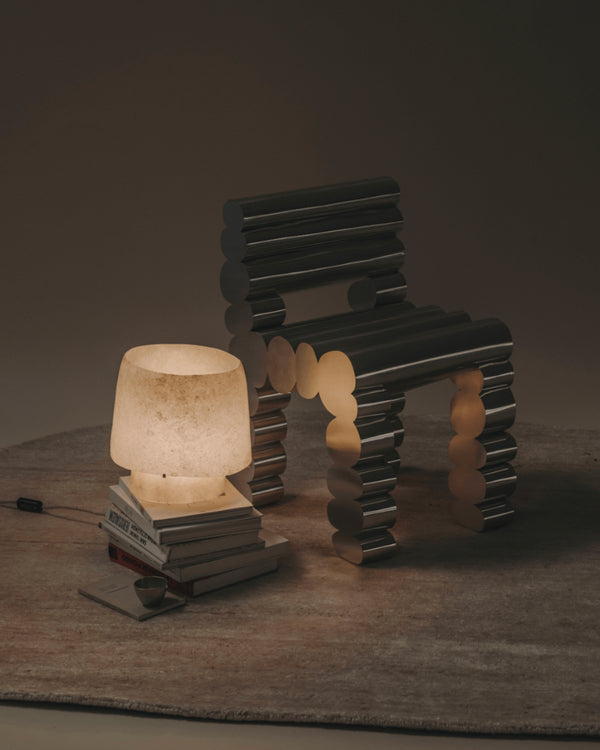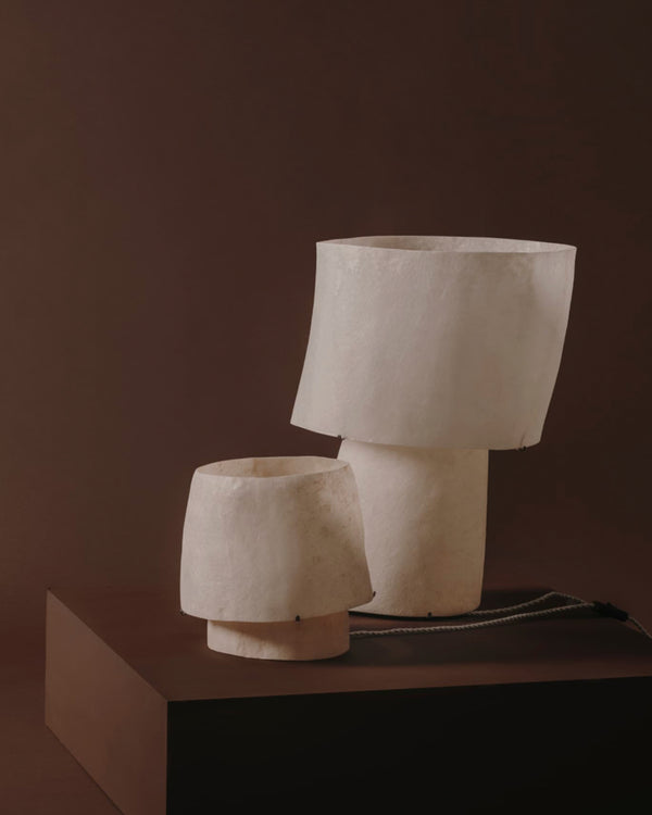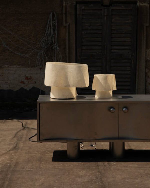 The Mush Lamp Tiny is an exploration of material, scale and form featuring a distinctive sculptural design made from fiberglass and organic resins. The intricate texture of the hand-crafted fiberglass adds a subtle depth that enhances the understated beauty of this piece, offering a unique visual and tactile experience.